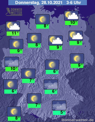 In der folgenden Nacht halten sich im Norden und vor allem an den Küsten zunächst noch oft einige, meist aufgelockert Wolken, hier lockert und klart es bis zum Morgen jedoch weiter auf. Im übrigen Land ist es schon verbreitet gering bewölkt oder sternenklar. Es bleibt landesweit trocken bei Tiefstwerten von 11 Grad in Cuxhaven und bis 5 Grad in München. Stellenweise kann sich Nebel bilden.