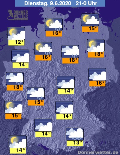 Am Abend dominieren meistens die Wolken und es fällt gebietsweise noch Regen, oder es gehen örtliche Schauer nieder, vereinzelt auch mit Blitz und Donner. Lediglich im Rheinland, sowie im Küstenumfeld von Nord- und Ostsee lässt sich die allmählich untergehende Sonne gelegentlich blicken.