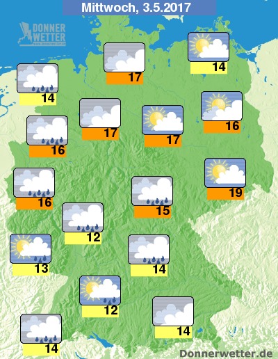 Ein kleines Regengebiet zieht von Süddeutschland über das Rhein-Main-Gebiet Richtung Kölner Bucht. Gegen Abend erreicht es die belgisch-niederländische Grenze. In diesen Bereichen kann es örtlich wieder kräftiger regnen. Auch sonst dominieren abgesehen von einigen größeren Aufheiterungen die Wolken und es können sich nachmittags teilweise Regenschauer bilden. Die Höchsttemperaturen liegen meist zwischen 12 und 19 Grad erreicht. Im Norden frischt der Ostwind zum Teil spürbar auf. In der Nacht zieht ein weiteres Regengebiet von Polen und Tschechien Richtung Sachsen und Brandenburg hinein.