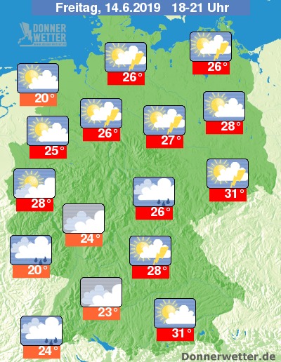 Die Temperaturen liegen am frühen Abend im Südwesten und an der See meist nur im Bereich zwischen 20 und 25 Grad, sonst werden noch 25 bis 31 Grad gemessen.