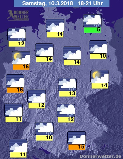 In der Nacht zum Sonntag klingen letzte Niederschläge meist rasch ab, vor allem entlang des Mittel- und Oberrheins sowie am Erzgebirge fällt bis zum Morgen noch gebietsweise Regen, sonst lockert es verbreitet auf. Vom Norden bis zur Mitte des Landes ist es häufig nur gering bewölkt. Die Temperatur sinkt auf 9 Grad im Oberrheingraben und bis 4 Grad im Thüringer Becken.
