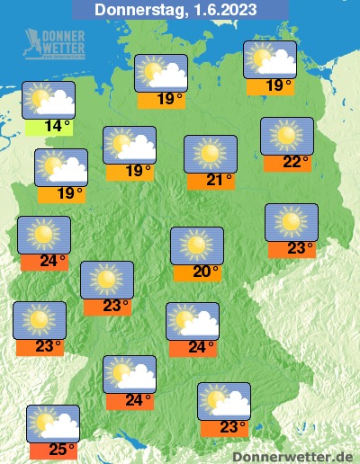 Am Donnerstag ziehen über den Nordwesten gebietsweise einige Wolken hinweg. Im großen Rest der Republik ist es hingegen verbreitet sonnig oder es ziehen lediglich lockere Wolken durch, dabei bleibt es trocken. Die Temperatur steigt auf frische 14 Grad in Bremerhaven und bis 25 Grad in Freiburg.