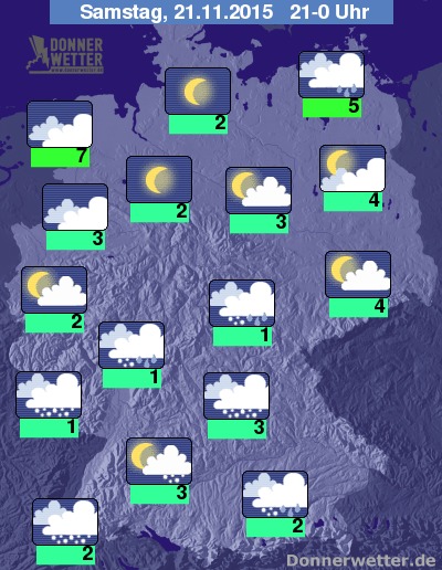 In der Nacht zum Sonntag ist der Himmel im Norden oft locker bis aufgelockert bewölkt, dabei bleibt es hier größtenteils trocken. Im Süden Deutschlands fällt unter dichten Wolken hingegen teils langanhaltender Schnee oder Schneeregen, auch über der breiten Mitte ist es meist stark bewölkt und es fällt gebietsweise Regen, Schneeregen oder Schnee. Es muss verbreitet mit Straßenglätte durch Schnee oder überfrierende Nässe gerechnet werden. Die Temperatur sinkt auf 6 Grad in Ostfriesland und bis auf frostige -2 Grad am Odenwald.
