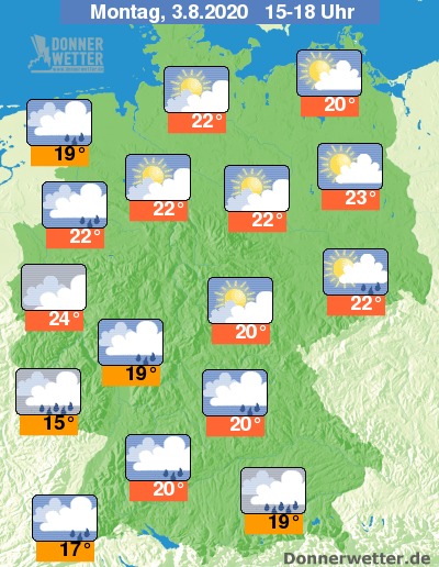 In den Nachmittagsstunden zeigt sich der Himmel über dem Norden zunächst noch heiter bis wolkig, am späteren Nachmittag auch stärker bewölkt, und es bleibt bis auf einzelne Schauer im Nordwesten überwiegend trocken. In der Südhälfte überwiegt am Montagnachmittag starke Bewölkung oder der Himmel ist bedeckt - dabei muss verbreitet mit Schauern gerechnet werden, die zeitweise auch ergiebiger ausfallen können.