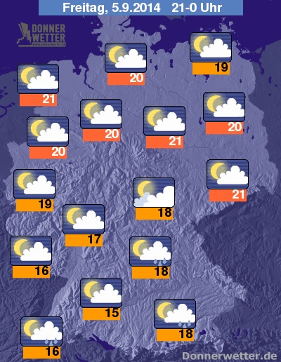 Am Abend sind im Süden, vor allem am Alpenrand, und vereinzelt auch noch im Westen weitere Schauer und Gewitter möglich, sonst ist es größtenteils aufgelockert bewölkt, zeitweise auch klar und es bleibt weitgehend trocken. Die Abendtemperatur liegt bei 21 Grad in Dessau und etwas frischeren 15 Grad an der Schwäbischen Alb.