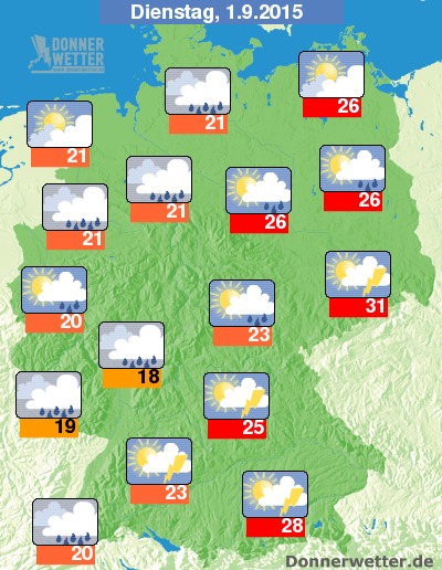 Am Dienstag scheint im Osten und vor allem im Süden anfangs noch häufig die Sonne. Im übrigen Land ziehen bereits am Morgen meist schon viele und oft dichte Wolken durch und es können sich teils kräftige Schauer und Gewitter entwickeln. Im Tagesverlauf breiten sich die Schauer und Gewitter auch bis in den äußersten Süden und Osten Deutschlands aus, während die Niederschläge im Norden und Westen nach und nach abklingen, hier und da kann es dann auch etwas auflockern. Die Temperatur steigt auf kühle 18 Grad am Westerwald und auf nochmals heiße 31 Grad an der Neiße.