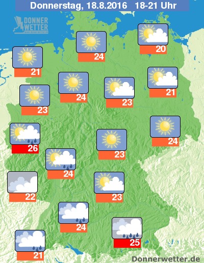 Heute Abend strahlt über der Nordosthälfte der Republik verbreitet die Sonne und es ziehen nur hier und da einige lockere Wolkenfelder durch, dazu bleibt es trocken. Vom Südwesten bis in den Süden Deutschlands, teils auch im südlichen NRW ziehen hingegen oft dichte Wolken durch und es bilden sich zum Teil kräftige Schauer, lokal sind auch Gewitter möglich. Die Temperatur liegt bei 20 Grad in Stralsund und um 26 Grad in Bonn.