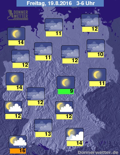 In der Nacht zum Freitag ist es vor allem am Alpenrand, aber auch im übrigen Süden und im Südwesten des Landes gebietsweise stark bewölkt und es bilden sich einzelne Schauer oder auch Gewitter. In der zweiten Nachthälfte klingen die Niederschläge, mit Ausnahme des Alpenrands, weitgehend ab und es lockert auf. Im Rest der Republik ist es hingegen bereits zu Beginn weitgehend sternenklar und es bleibt trocken. Die Temperatur sinkt auf 16 Grad in Freiburg und bis etwa 9 Grad im Eichsfeld.