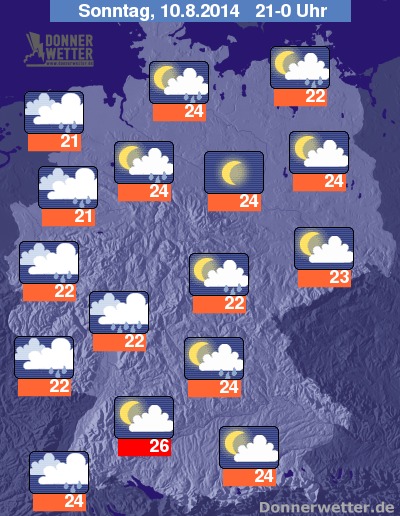 Am Abend bilden sich neben teils heiteren Wetterabschnitten weitere Schauer und Gewitter, überwiegend trocken bleibt es dabei meist im Osten und Süden des Landes, aber auch hier besteht eine leichte Gewittergefahr. Die Abendtemperatur liegt bei schwülwarmen 26 Grad in Karlsruhe und ebenfalls sehr milden 21 Grad am Niederrhein.