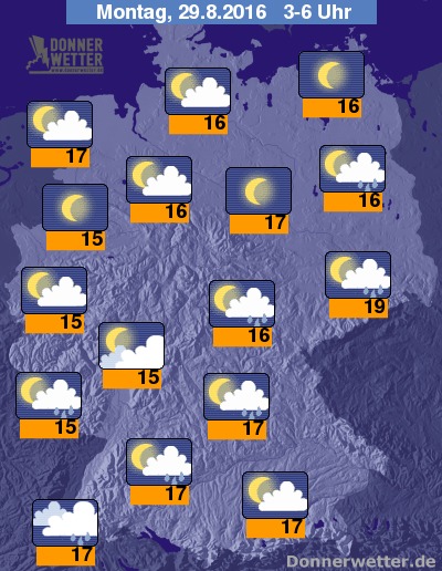 In der Nacht zum Montag bilden sich besonders über der Südosthälfte gebietsweise kräftige Schauer und Gewitter, häufig ist es hier aber auch nur leicht oder aufgelockert bewölkt. Weiter nach Nordwesten hin zeigt sich der Himmel überwiegend locker bewölkt oder sternenklar und es bleibt weitgehend trocken. Die Temperatur sinkt auf 19 Grad in Dresden und bis etwa 15 Grad im Saargau.