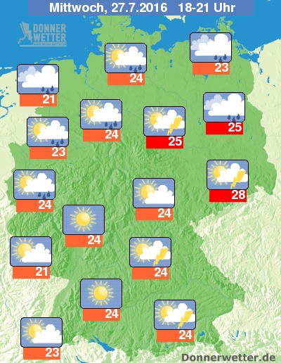 Heute Abend ist es vom Südwesten bis in die Landesmitte hinein verbreitet heiter bis sonnig und dazu weitgehend trocken. Oft stark bewölkt bleibt es im Nordosten, Osten und Südosten der Republik, hier bilden sich wiederholt Schauer und zum Teil auch kräftige Gewitter. Im übrigen Bundesgebiet ist es teils aufgeheitert, teils ziehen dichte Wolken durch, dabei sind einzelne Schauer und vereinzelt auch Gewitter möglich. Die Temperatur liegt bei 21 Grad am Pfälzer Wald und um 28 Grad in Dresden.