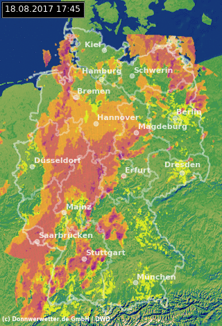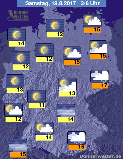 In den übrigen Landesteilen ist es teils stark, teils aufgelockert bewölkt, jedoch meist trocken. Die Temperatur sinkt auf 17 Grad in Dresden und bis 11 Grad am Westerwald.