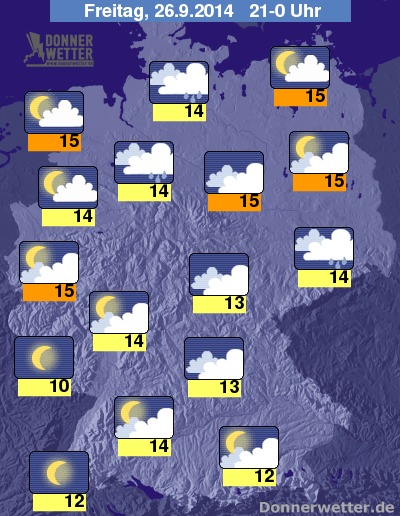 In der Nacht zum Samstag fällt unter meist dichten Wolken im Osten, Südosten und in der Mitte des Landes zeitweise Sprühregen, sonst ist es vielfach aufgelockert bewölkt, nach Südwesten und im äußersten Norden auch sternenklar und es bleibt trocken. Jedoch bildet sich stellenweise Nebel oder Dunst. Die Temperatur sinkt auf 14 Grad in der Lausitz und etwa 7 Grad im Saargau.