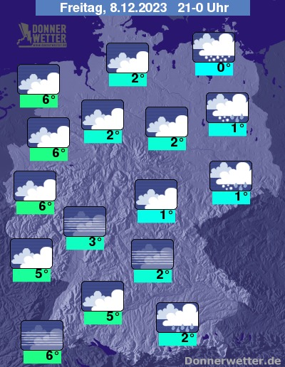 Am späten Abend und in der Nacht fällt meist nur noch in der Osthälfte etwas Schnee oder gefrierender Regen, auch am Alpenrand sind zeitweise Niederschläge möglich. In den übrigen Landesteilen bleibt es bei einer meist geschlossenen Wolkendecke überwiegend trocken.