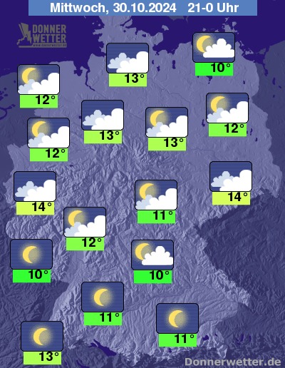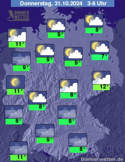 Der der Nacht zum Donnerstag ist es über der Nordhälfte des Landes aufgelockert bewölkt, vor allem im Süden und Südwesten bildet sich teils dichter Nebel. Es bleibt niederschlagsfrei.