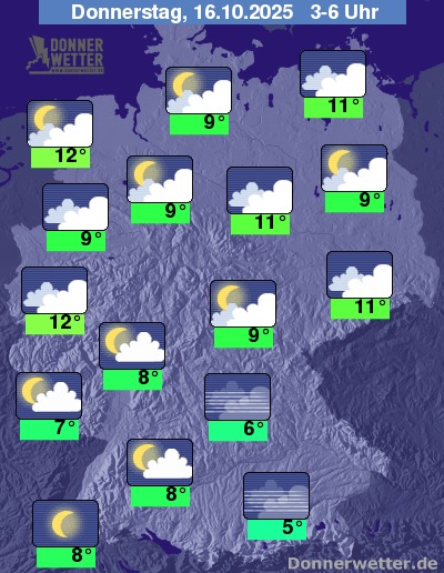 In der Nacht zum Donnerstag lockert und klart der Himmel vor allem im Süden häufig auf, zum Teil bildet sich hier Nebel. Im übrigen Land bleibt es eher stark bewölkt, aber Auflockerungen sind zumindest möglich, dazu bleibt es weitgehend trocken. Die Temperatur sinkt auf 12 Grad an der Nordsee und bis 5 Grad in Oberbayern.