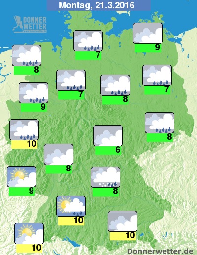 Heute ist es im Süden noch meist heiter oder wechselnd bewölkt und zum größten Teil auch trocken. Besonders über der Nordhälfte bleibt der Himmel aber bedeckt und es fällt zeitweise Regen oder Sprühregen. In den übrigen Landesteilen ist es meist stark bewölkt, jedoch zumeist auch trocken. Die Temperatur steigt auf 7 Grad in der Norddeutschen Tiefebene und bis zu 11 Grad im Breisgau.