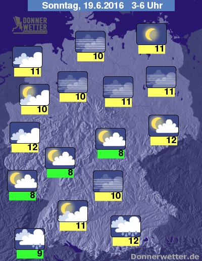 In der Nacht zum Sonntag sind im Großteil des Landes anfangs hier und da noch vereinzelte Schauer, selten auch Gewitter möglich. Im Nachtverlauf klingen die Niederschläge und seltenen Gewitter jedoch weitgehend ab und der Himmel ist oft nur locker bewölkt, zum Teil auch sternenklar. Am Alpenrand bleibt es dagegen bei meist dichter Bewölkung, dazu fällt hier zum Teil kräftiger und langanhaltender Regen. Die Temperatur sinkt auf 12 Grad in Köln und bis etwa 8 Grad am Pfälzer Wald.