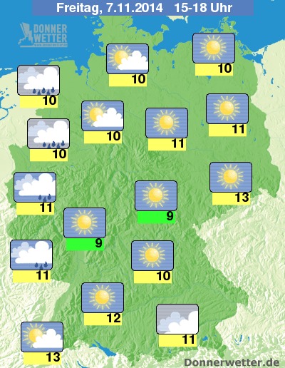 Heute Nachmittag scheint verbreitet die Sonne bei einem zumeist gering bewölktem oder wolkenlosem Himmel, jedoch halten sich im Südosten auch dichte Wolken mit gebietsweise leichtem Regen und auch im äußeren Westen ziehen dichte Wolken mit Regen auf, sonst bleibt es aber trocken. Die Temperatur liegt bei 9 Grad am Spessart und etwa 13 Grad im Breisgau.