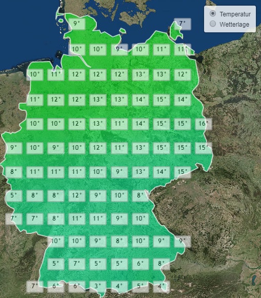 Dazu klaffen am frühen Freitag Morgen große Temperaturunterschiede zwischen dem Süden und Nordosten des Landes. Am Alpenrand fällt das Thermometer stellenweise auf Werte nur knapp über dem Gefrierpunkt, während es rund um Berlin und Dresden bei Werten um die 15 Grad sehr mild bleibt.