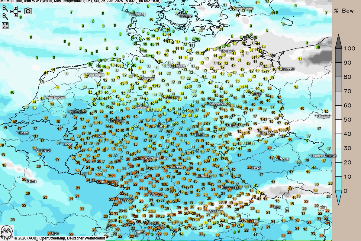 Wetter- / Temperaturen Samstagnachmittag (15:00 Uhr) nach ICON