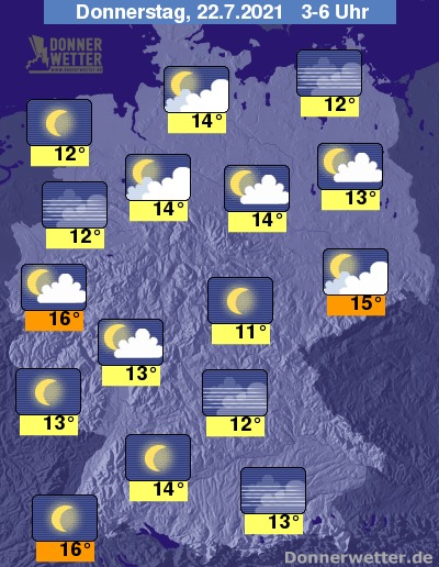 In der Nacht zum Donnerstag ist der Himmel übe der Bundesrepublik überwiegend sternenklar oder nur locker bewölkt. Im Norden und Osten halten sich oft dichtere Wolken, dazu bleibt es aber trocken. Die Temperatur sinkt auf 16 Grad in Freiburg und bis 11 Grad in Erfurt.