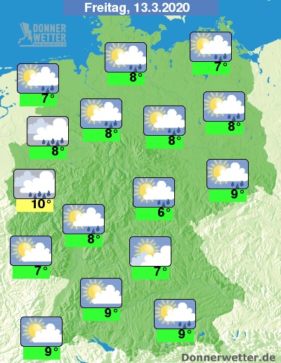 Die Höchsttemperaturen erreichen allgemein Werte zwischen 6 und 10 Grad.