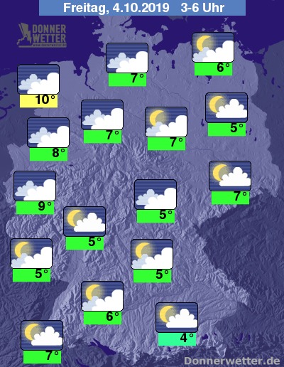 In den Frühstunden kühlt die Luft auf 3 bis 9 Grad ab, stellenweise muss mit leichtem Bodenfrost gerechnet werden. Direkt an der Nordsee, sowie auf den Inseln weilen die Temperaturen meist im zweistelligen Bereich.
