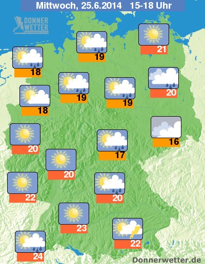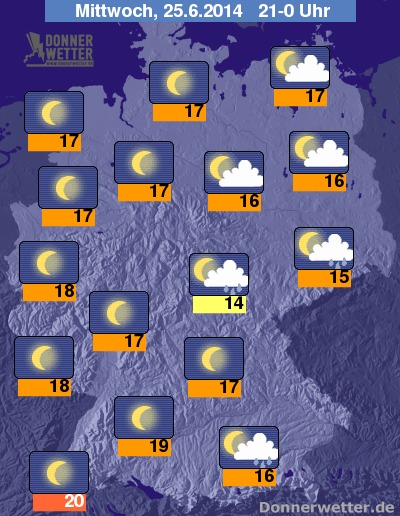 Am Abend klingen Schauer und Gewitter immer weiter ab, vor allem im Osten und Süden sind aber weiterhin Schauer und einzelne Gewitter möglich, sonst wird es verbreitet sternenklar und es bleibt trocken. Die Abendtemperaturen liegen bei 20 Grad in Freiburg und 14 Grad am Thüringer Wald.