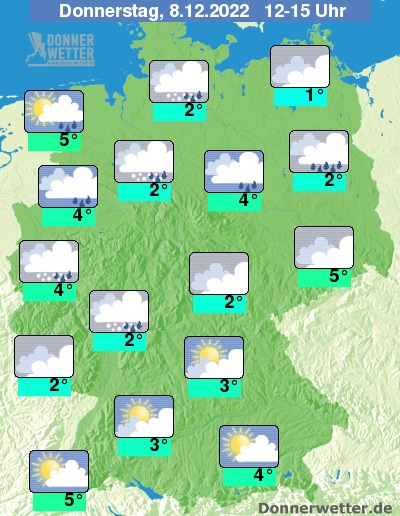 In den Nachmittagsstunden zeigt sich der Himmel über dem Süden des Landes sowie zeitweise auch in Küstennähe heiter oder es ist nur leicht bewölkt. Südlich des Mains bleibt es dabei meist trocken. In den übrigen Landesteilen bleibt der Himmel stark bewölkt oder ist bedeckt und zeitweise muss mit Niederschlägen gerechnet werden, die in den nördlichen und zentralen Mittelgebirgen auch als Schnee fallen können.