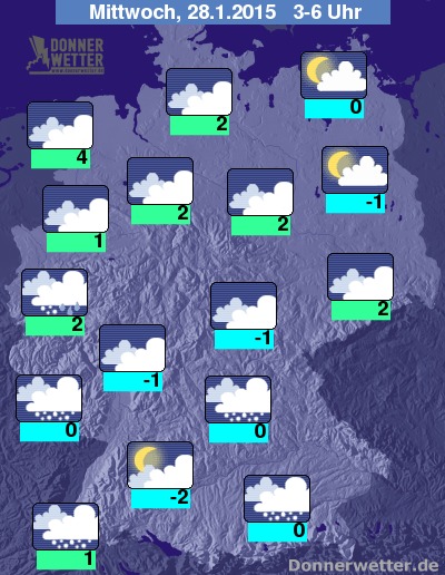 In der folgenden Nacht bleibt es größtenteils stark bewölkt, besonders in der Südhälfte der Republik bleiben die Wolken dabei zumeist dicht, hier fällt dazu immer wieder mal etwas Schnee, in den westlichen Landesteilen auch Schneeregen oder Regen. Es besteht Glättegefahr. Im Nordosten und im nördlichen Osten ist es meist aufgelockert bewölkt und trocken. Die Temperatur sinkt auf 4 Grad an der Nordseeküste und bis -2 Grad am Schwarzwald.