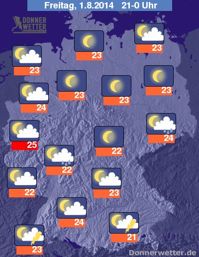 Heute Abend bleibt der Himmel überwiegend sternenklar oder aufgelockert bewölkt, nach Südwesten und gebietsweise auch im Osten ziehen auch dichtere Wolken durch, dabei sind vereinzelte Schauer und Gewitter möglich, sonst bleibt es aber weitgehend trocken. Die Abendwerte liegen bei mediteranen 25 Grad in Köln und kaum frischeren 21 Grad um München.