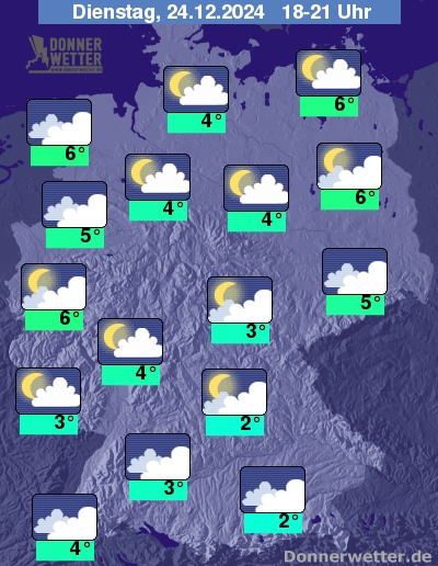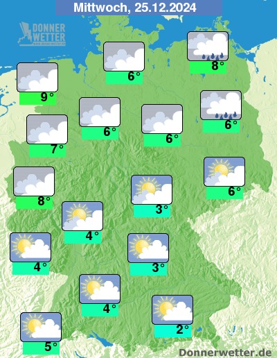 Am 1. Weihnachtsfeiertag ist es vor allem an den Alpen oft heiter, aber auch im übrigen Süden kann sich gebietsweise die Sonne zeigen, dabei bleibt es trocken. Weiter nach Norden hin ist es hingegen meist bedeckt, dabei fällt im Nordosten etwas Regen, sonst bleibt es weitgehend trocken. Die Temperatur steigt auf  2 Grad in Oberbayern und bis 9 Grad im nördlichen Emsland.