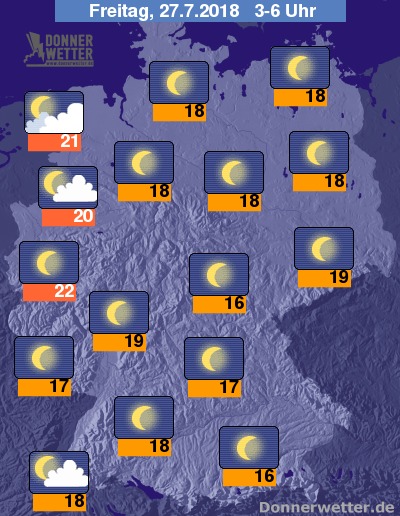 Dabei liegen die Tiefsttemperaturen verbreitet bei Werten zwischen 15 und 20 Grad. Im Nordwesten steht uns bei Temperaturen knapp über der 20 Grad Marke die nächste Tropennacht bevor.