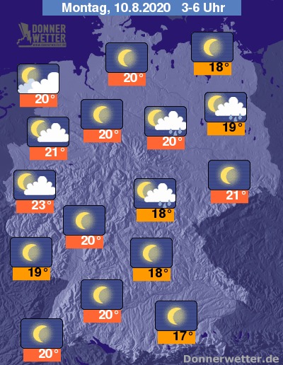 In der Nacht zum Montag ist es überm Bundesgebiet größtenteils sternenklar, teils ziehen lockere Wolken durch. Von der Landesmitte bis in den Osten Deutschlands bilden sich gebietsweise dichte Wolken, die hier einzelne Schauer und Gewitter bringen können, ansonsten bleibt es aber trocken. Die Temperatur sinkt auf örtlich sehr warme 23 Grad im Rheinland und bis auf etwas kühlere 17 Grad um Augsburg.