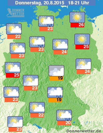 Am Nachmittag ist es überwiegend in der kompletten Republik heiter, im Münsterland und am Schwarzwald bedecken teils Wolken den Himmel. In Bayern und in Thüringen ist mit lokalen Schauern zu rechnen. In Mittelfranken kann es etwas mehr  regnen kommen. Die Temperaturen steigen auf Werte von 19 Graad C bis zu 26 Grad C.