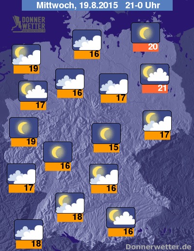 Am späteren Abend verbessert sich die Wetterlage im Ostfriesland und in Sachsen. Im Rest der Region hält das Wetter an und bleibt auch in den späten Stunden weiterhin heiter. Die Temperaturen sinken von 21 Grad C in bis auf 15 Grad C runter.