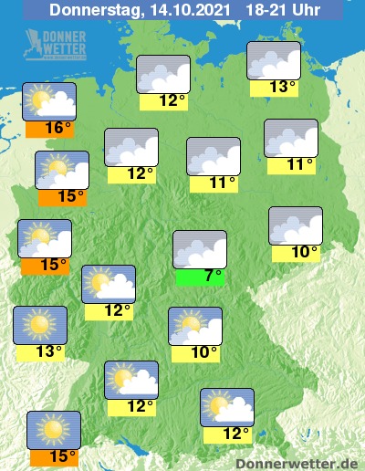 Heute Abend lockert und heitert der Himmel vor allem im Südwesten, aber auch im übrigen Süden und teils im Westen weiter auf. Weiter nach Nordosten hin halten sich hingegen weitgehend dichte Wolken, jedoch bleibt es auch hier trocken. Die Temperatur liegt bei 7 Grad in Jena und bis 16 Grad in Bremerhaven.