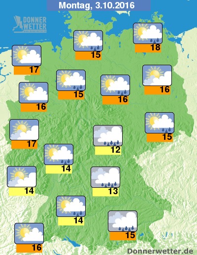 Am Montag, dem Tag der Deutschen Einheit zeigt sich das Wetter insgesamt sehr wechselhaft mit oft vielen, zeitweise dichten Wolken und dazu auch möglichen Schauern. Seltener sind auch Gewitter möglich. Es werden herbstliche 13 bis 17 Grad erreicht.