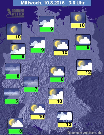 In der bevorstehenden Nacht fällt im Alpenvorland unter meist dichten Wolken immer wieder Regen. Oft stark bewölkt, jedoch weitgehend trocken bleibt es über dem übrigen Süddeutschland und über Sachsen. Sonst ist es vor allem im Norden und Nordwesten oft stark, teils aber auch nur locker bewölkt und zumeist trocken. Im Rest der Republik ist es größtenteils locker bewölkt oder sternenklar und trocken. Die Temperatur sinkt auf 12 Grad in Dresden und bis 6 Grad im Bliesgau.