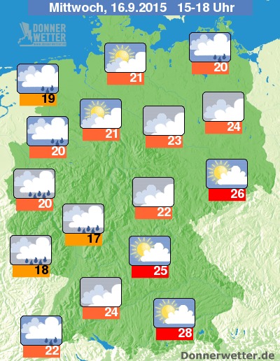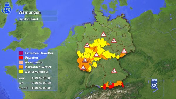 Heute Nachmittag bleibt es im Südosten und im äußeren Osten des Landes weitgehend locker oder aufgelockert bewölkt und trocken. Im großen Rest des Landes ziehen aber überwiegend dichte Wolken durch und es fällt zeitweise, zum Teil kräftiger, langanhaltender und auch ergiebiger Regen, dazu besteht für Autofahrer die Gefahr durch Aquaplaning bei zusätzlich teils schlechten Sichtverhältnissen. Besonders im äußeren Westen und Südwesten sind auch einzelne Gewitter möglich. Die Temperatur steigt auf 17 Grad am Taunus und bis auf sommerliche 28 Grad in München. Zusätzlich weht im Westen und Norden des Landes ein verbreitet frischer bis starker Wind, an der Nordsee und in den Mittelgebirgen sind bei teils stürmischem Wind auch Sturmböen möglich.