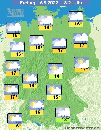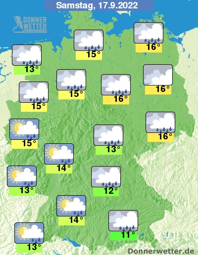 In der Nacht zum Samstag ist der Himmel über dem Süden und über Vorpommern häufig locker bis aufgelockert bewölkt, sonst ziehen jedoch verbreitet dichte Wolken durch und es bilden sich gebietsweise Schauer. Im Ostseeumfeld entwickeln sich örtliche Gewitter. Die Tiefstwerte liegen bei 12 Grad in Emden und etwa 6 Grad in Erfurt. An der Nordsee weht ein stürmischer Wind.