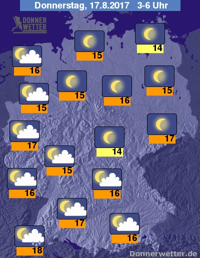 In der Nacht zum Donnerstag sind über dem Alpenvorland anfangs noch einige, teils dichte Wolken unterwegs, die hier jedoch kaum noch Schauer bringen, sonst ist der Himmel vor allem im Norden und Osten überwiegend sternenklar und im übrigen Bundesgebiet locker bewölkt, dabei bleibt es trocken. Die Temperatur sinkt auf milde 18 Grad im Breisgau und bis etwa 14 Grad an der Müritz.
