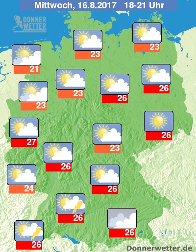 Heute Abend ist es im Süden noch oft stark bewölkt, dazu sind weitere Schauer, hier und da auch Gewitter möglich, sonst zeigt sich das Wetter verbreitet heiter oder aufgelockert bewölkt und dazu trocken. Im Osten ist es auch oft wolkenlos. Die Temperatur liegt bei 21 Grad in Cuxhaven und bis 27 Grad in der Kölner Bucht.