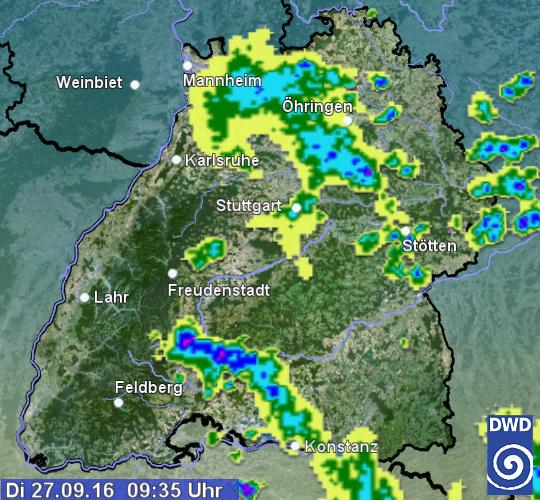 Nachdem in der vergangenen Nacht vor allem im Landkreis Tuttlingen (Baden-Württemberg) unwetterartige Niederschlagsmengen und großkörniger Hagel zu verzeichnen war, beschränken sich aktuelle Schauergebiete ebenfalls meist nur auf Teile Baden-Württembergs.