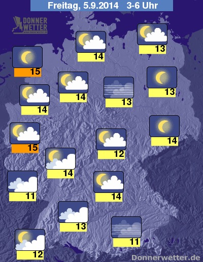 In der Nacht zum Freitag bleibt es größtenteils bei der lockeren bis aufgelockerten Bewölkung, besonders nach Südwesten halten sich auch häufig dichte Wolken, Regen fällt dabei kaum, vielfach klar wird der Himmel dagegen sowohl im Nordwesten als auch im Osten der Bundesrepublik. Die Temperatur sinkt auf 15 Grad im Rheinland und etwa 11 Grad im Allgäu.