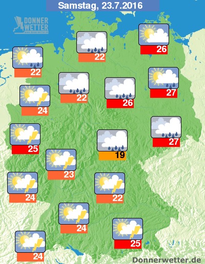 Am Samstag können neben zeitweiligen Auflockerungen auch immer wieder dichte Wolken durchziehen, die für teils kräftige Schauer und Gewitter sorgen. Trocken bleibt es voraussichtlich nur im äußersten Nordosten des Landes.