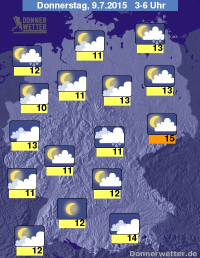 In der Nacht zum Donnerstag zeigt sich der Himmel wechselnd bewölkt, vor allem im Süden ist es auch oft nur gering bewölkt und dazu trocken, sonst zieht jedoch auch immer wieder auch starke Bewölkung durch und hier und da sind einzelne Schauer möglich, zumeist bleibt es aber trocken. Die Temperatur sinkt auf milde 15 Grad in Dresden und bis 10 Grad im Münsterland.