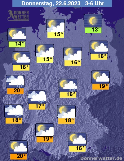 In der Nacht zum Donnerstag zeigt sich der Himmel über dem Land oft locker bis aufgelockert bewölkt. Im Westen und Südwesten ziehen jedoch meist dichte Wolken durch und dazu sind hier einzelne Schauer, selten auch Gewitter möglich. Im übrigen Land ist es meist trocken. Die Temperatur sinkt auf tropische 20 Grad in Köln und bis 13 Grad in Rostock.