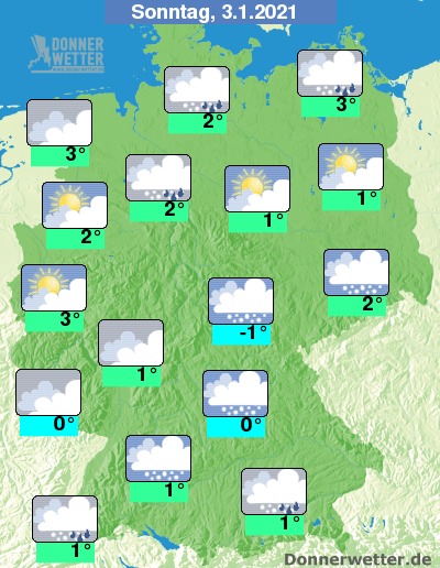 An Silvester im Westen Niederschläge in Form von Regen und Schneeregen, im Bergland Schnee mit Glättegefahr. Nach Osten hin auch Aufheiterungen. Über Sachsen verbreitet sonnig.
